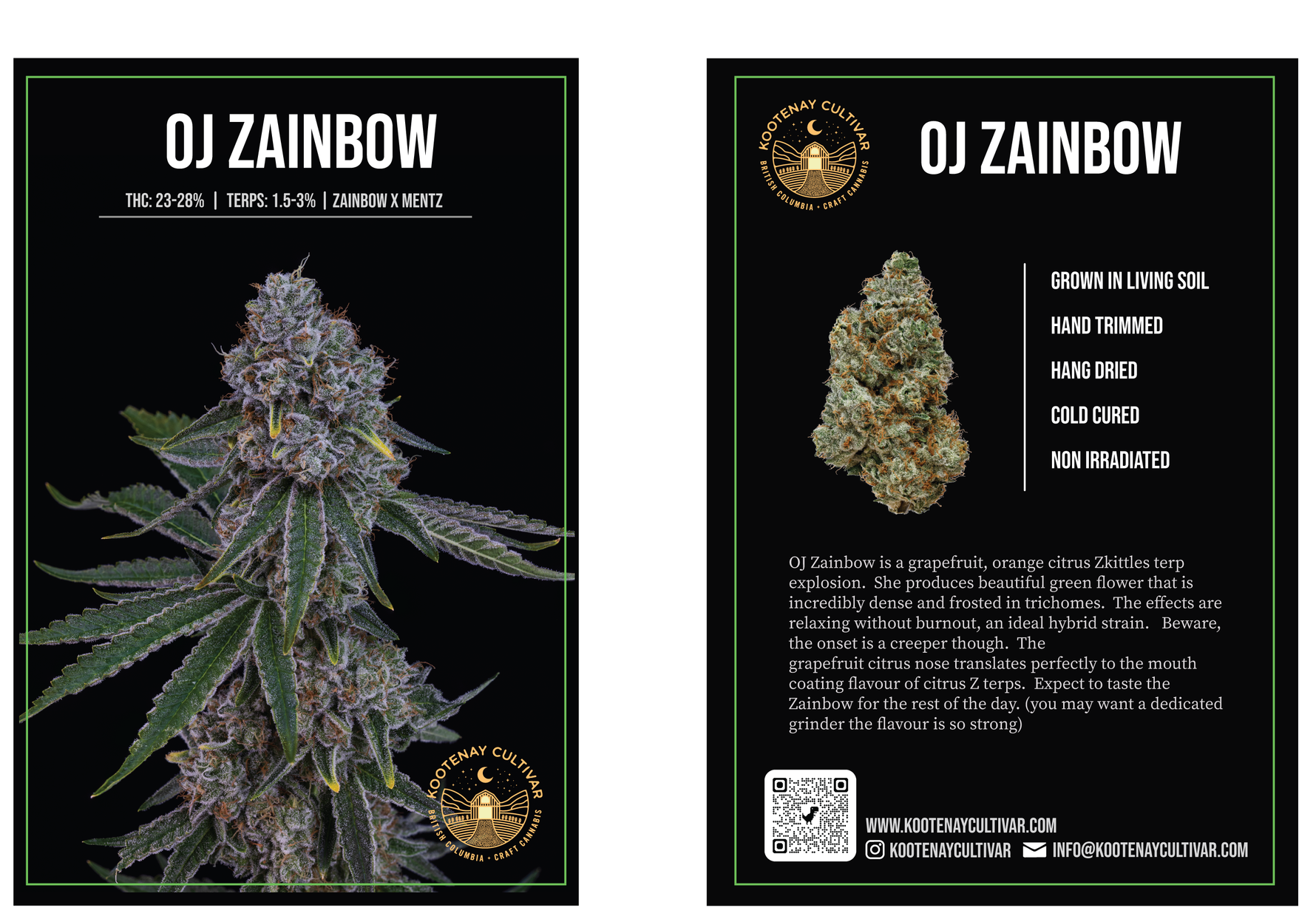 OJ Zainbow is a legendary grapefruit and orange citrus Zkittlez terp explosion! It produces beautiful, incredibly dense green flower that is heavily frosted in trichomes. The intense grapefruit citrus nose translates perfectly into a mouth-coating flavor of citrus Z terps that you can expect to taste all day long. As an ideal hybrid strain, the effects are relaxing without burnout, but beware—the onset is known to be a creeper! (Genetics: Zainbow x Mentz)