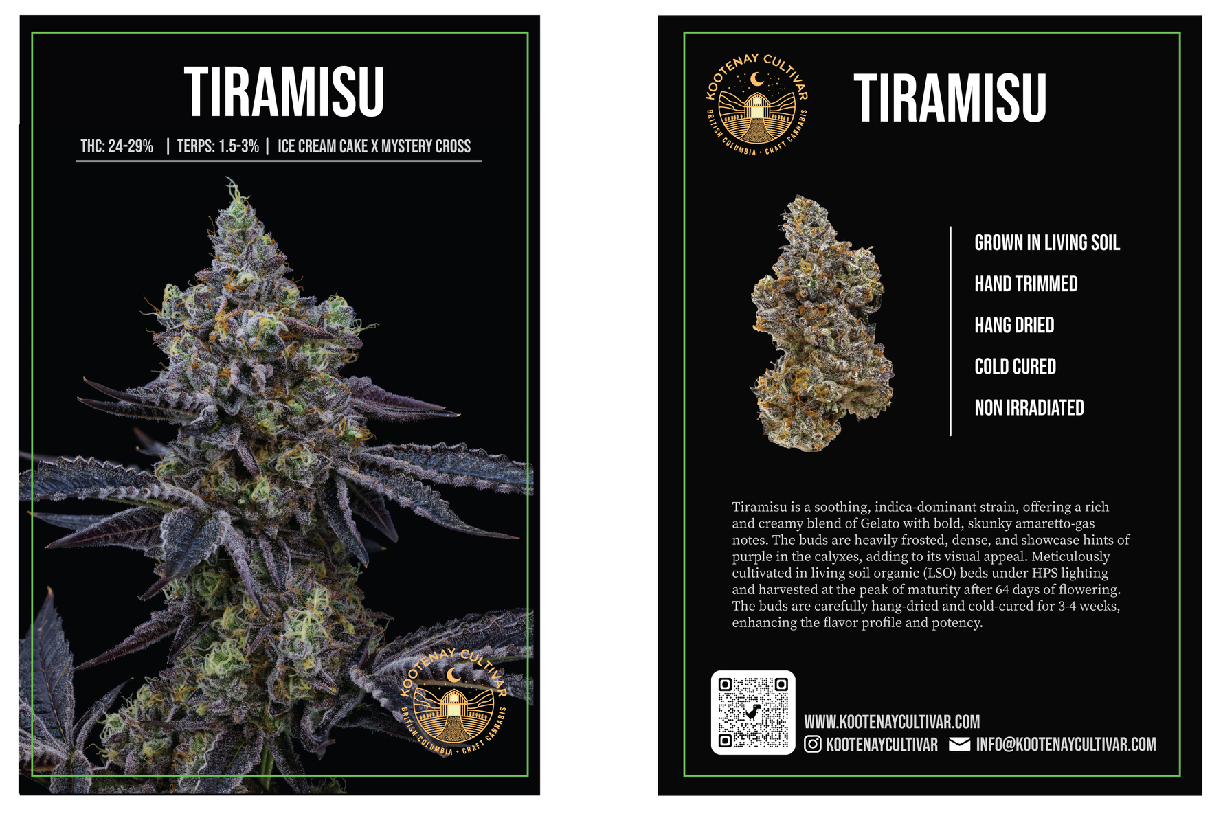 Tiramisu is a deeply relaxing indica dominant strain offering a unique, luxurious profile. Expect creamy gelato notes highlighted by skunky amaretto gas. The buds are heavily frosted and dense, featuring subtle purple calyxes. This is a craft product, grown in Living Soil Organics (LSO) beds under HPS lighting and finished with an extensive cure: hung dry and cold cured for 3-4 weeks. Perfect for evening relaxation.